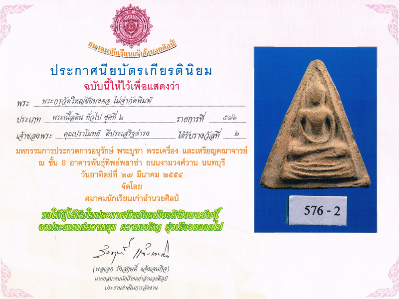 ยิ่งใหญ่ อลังการสุดๆ เป็นตำนานแล้วครับ ผมไม่เห็นพระพิมพ์นี้เป็นเวลานานมาก ดีใจสุดๆครับที่ได้มาครอบครอง กรุวัดใหญ่ชัยมงคล มีพระขึ้นมาจากกรุ 3 พิมพ์ครับ คือ พระขุนแผนเคลือบ พระขุนแผนใบพุทรา ซึ่งราคาหลายล้านหลายแสนบาทแล้วครับ น้อยคนนักที่จะทราบว่า มีสมเด็จนางพญาขึ้นมาด้วย ตัวจริงเสียงจริงหายากมากๆครับ ที่เห็นส่วนใหญ่มีแต่ตัวปลอม สำหรับองค์นี้ ได้ที่2 ประเภทพระกรุวัดใหญ่ชัยมงคลไม่จำกัดพิมพ์ ผมก็ไม่รู้ว่าที่1เป็นพิมพ์อะไร แต่รู้ว่าองค์นี้ไม่ธรรมดาแน่นอน ผมเป็นอีกคนหนึ่งครับ ที่รักเคารพและรู้คุณค่า ของพระกรุ สุดชีวิตจิตใจ