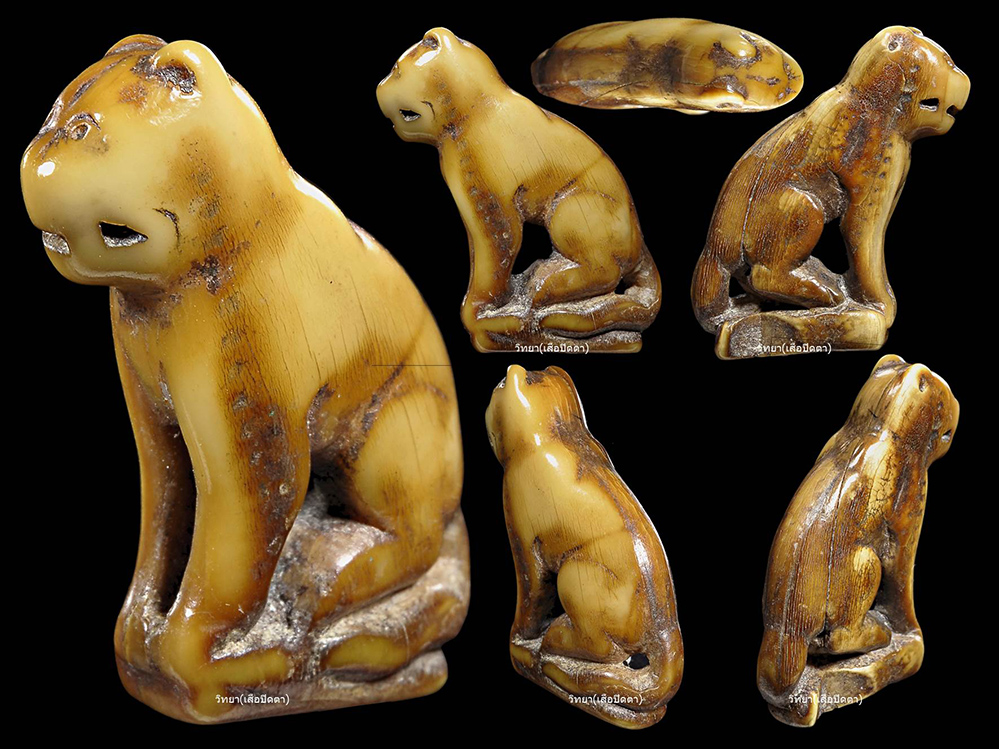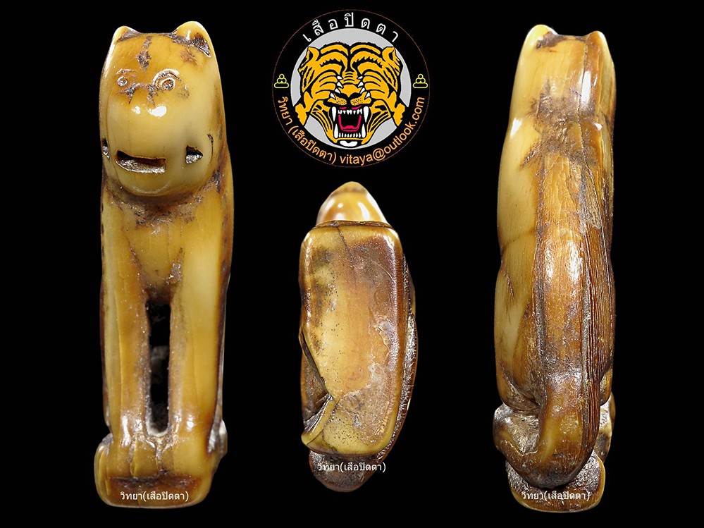 วิทยา(เสือปิดตา) 09-4554-4454 vitaya@outlook.com /// เสือหลวงพ่อปาน วัดบางเหี้ย หรือวัดมงคลโคธาวาส คือ สุดยอดจักพรรดิ์แห่งเครื่องรางอันดับ 1 ของประเทศในชุดเบญจภาคีเครื่องราง "หลวงพ่อปาน" หรือ "พระครูพิพัฒน์นิโรธกิจ" เป็นชาวบางบ่อ ตำบลบางเหี้ย จังหวัดสมุทรปราการ เกิดเมื่อปี พ.ศ. 2368 มรณภาพเมื่อ วันที่ 29 สิงหาคม 2453 เสือของท่านดีทางมหาอำนาจ และคงกระพันยอดเยี่ยม หรือจะใช้ในทางเมตตามหานิยม ค้าขายของก็ดี ในปี พ.ศ. 2443 พระบาทสมเด็จพระจุลจอมเกล้าเจ้าอยู่หัว รัชกาลที่ 5 เสด็จไปที่ตำบลบางเหี้ย เพื่อที่จะทำพิธีเปิดประตูน้ำ ปรากฏเรื่องที่หลวงพ่อปานได้เอาชิ้นหมูเสียบกับไม้ แกว่งล่อเอาเสือที่ตกลงน้ำต่อหน้าพระพักตร์ หลังจากนั้นพระพุทธเจ้าหลวง มีรับสั่งถามว่า "ที่แจกเครื่องรางเป็นรูปเสือมีความหมายอย่างไร ?" หลวงพ่อปานทูลตอบว่า "ได้ไปรุกขมูลธุดงค์ในป่า พบเสือใหญ่หลายครั้ง ได้สังเกตดูเห็นว่า "เสือ" เป็นสัตว์ปราดเปรียว ฉลาด ว่องไว เฉียบขาด มีตบะ และอำนาจ สามารถที่จะใช้ตาสะกดสัตว์อื่นให้อยู่ในอำนาจได้ คนทั่วไปเรียกผู้ร้ายใจฉกรรจ์ว่า "ไอ้เสือ" ก็คือเอาความเก่งกาจของเสือมานั่นเอง การที่ทำเครื่องรางรูปเสือ มิใช่จะสนับสนุนให้คนกลายเป็น "อ้ายเสือ" เพียงแต่ต้องการเอาลักษณะของเสือจริงในป่า ที่ปราดเปรียว ว่องไว เฉลียวฉลาด เฉียบขาดมาเป็นตัวอย่างเท่านั้น" พระพุทธเจ้าหลวงทรงพระราชทานผ้าไตร ผ้ากราบ และได้พระราชทานสมณศักดิ์เป็น "พระครูพิพัฒน์นิโรธกิจ" พระราชนิพนธ์เรื่อง "เสด็จประพาส มณฑลปราจิณ" ได้เล่าถึงหลวงพ่อปานความตอนหนึ่งว่า "คุณวิเศษที่คนเลื่อมใสคือ ให้ลงตะกรุด ด้ายผูกข้อมือ รดน้ำมนต์ ที่นิยมกันมากคือ เขี้ยวเสือแกะเป็นรูปเสือ เล็กบ้าง ใหญ่บ้าง ฝีมือหยาบๆ . เวลาแย่งชิงก็ขึ้นไปถึง 3 บาท ว่า 6 บาทก็มี ได้รูปเสือนั้นแล้วจึงไปให้พระครูปลุกเสก" การพิจารณาเสือหลวงพ่อปานต้องดูที่ รูปทรง ศิลป์ ฟอร์มการแกะ ความเก่าตามธรรมชาติของเขี้ยว แต่สิ่งสำคัญที่สุดก็คือ "รอยจาร" หรือลายมือของหลวงพ่อ ส่วนมากรอยจารใต้ฐานจะมี ยันต์ "อุ" อยู่ด้านบน ยันต์ "กอหญ้า" อยู่ซ้ายขวา และ ยันต์ "ฤ ฤา" ด้านล่าง (หากเป็นเขี้ยวซีกโดยปกติจะมีแค่ยันต์กอหญ้า ถ้าพิเศษขึ้นมาจะมีจาร ฤ ฤา) บริเวณตามลำตัวเสือจะเป็นตัวเลขไทย และยันต์อุ การจดจำลายมือนั้นสำคัญมาก จากนั้นค่อยพิจารณาถึงศิลป์การแกะของช่าง หากจะแบ่งเสือหลวงพ่อปานแบบลึกๆนั้น สามารถแบ่งได้เป็น 6 อย่างคือ 1)อ้าปากจารปกติ 2)หุบปากจารปกติ 3)ศิลป์วัดกลางหรือศิลป์ชาวบ้าน 4)อ้าปากจารขน 5)หุบปากจารขน และ6)ศิลป์พิเศษ หรือเสือตาเม็ด หร