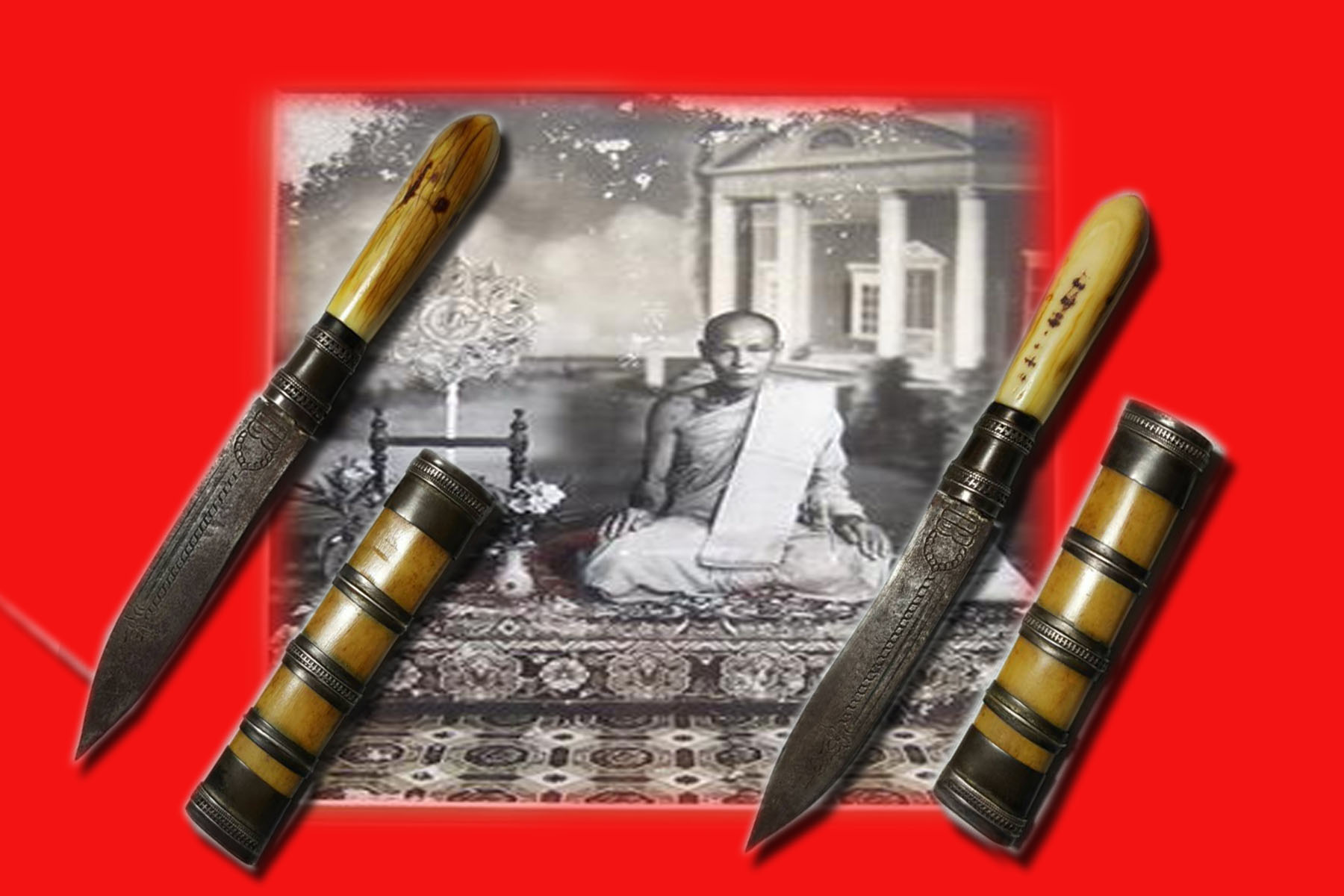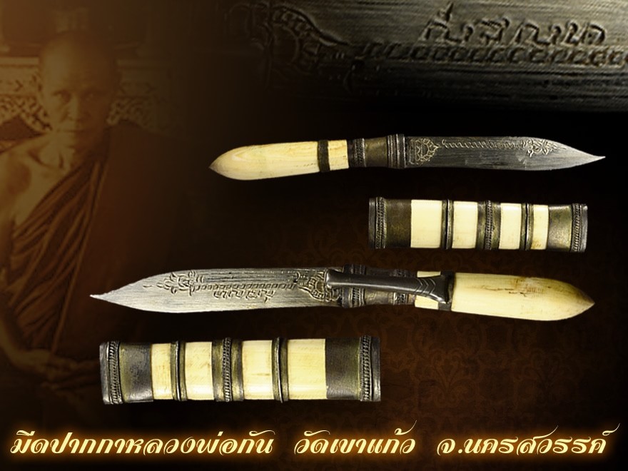 มีดปากกา หลวงพ่อกัน วัดเขาแก้ว จ.นครสวรรค์ (2 ด้าม) 1. ด้ามเป็นงา ฝักเป็นเขากวาง. ใบมีดเป็นเหล็ก (ยุคต้น) ความยาวรวม 4.8 นิ้ว 2. ด้ามเป็นงา ฝักเป็นงา ใบมีดเป็นสเตนเลส ความยาวรวม 5 นิ้ว