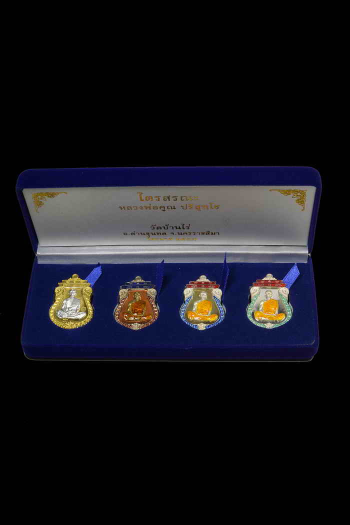 หลวงพ่อคูณ วัดบ้านไร่ รุ่น ไตรมาส ๕๗ { ไตรสรณะ } ชุด กรรมการ จัดสร้าง ๙๙ ชุด ตอกโค๊ต / เบอร์เลข No 16 พร้อมกล่อง ๔ เหรียญ พร้อมกล่องเดิมๆ