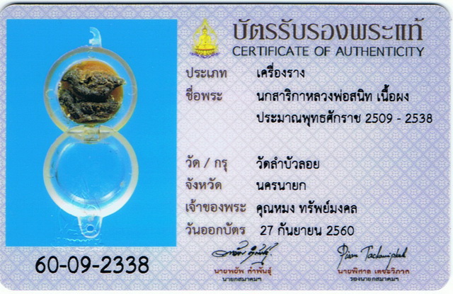 นกสาริกาคู่ รุ่นแรก (พิมพ์ใหญ่) หลวงพ่อสนิท วัดลำบัวลอย หายากมาก พุทธคุณเด่นทางด้านเมตตามหานิยม+ ใบเซอร์สมาคม ฯ