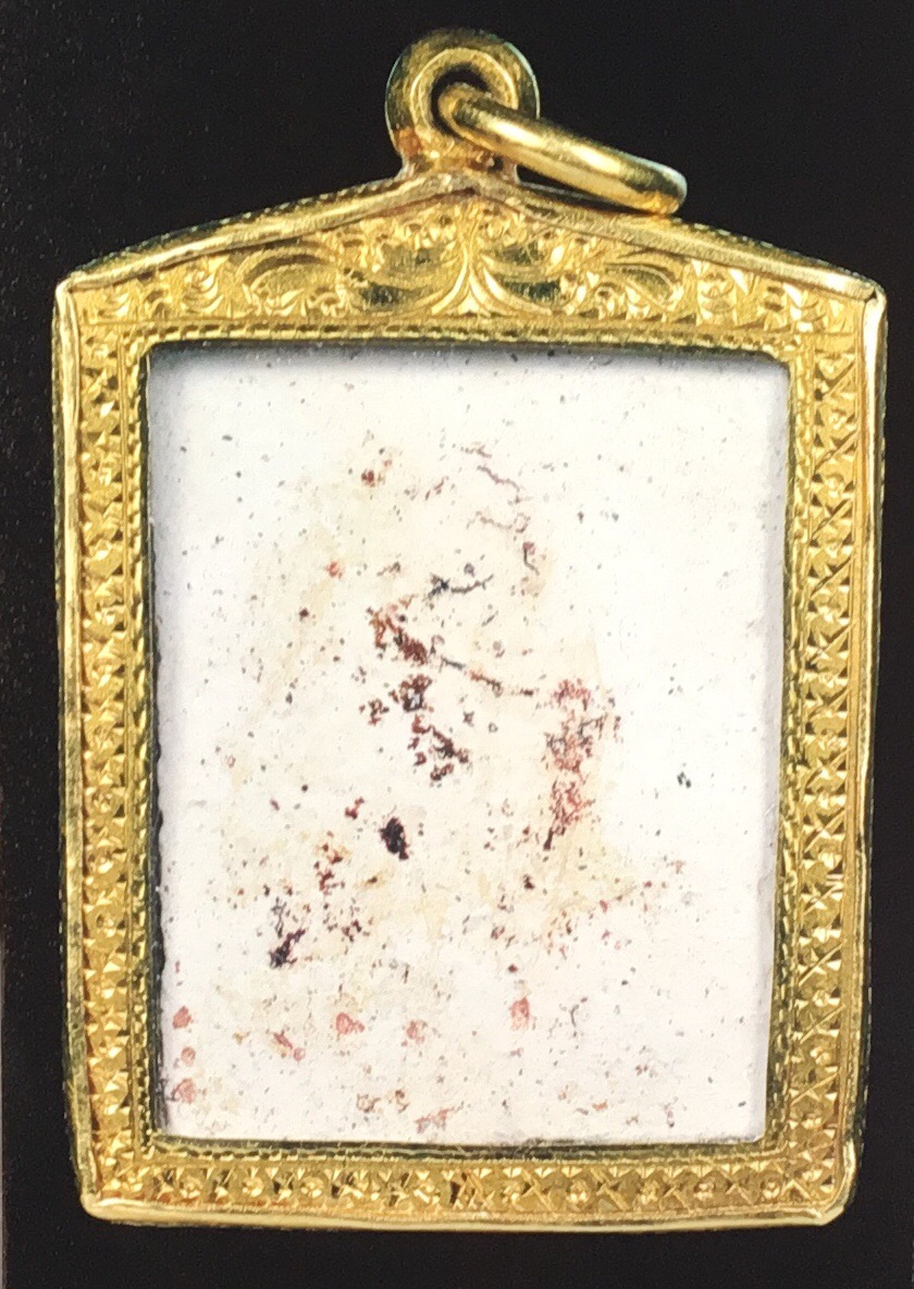 พระปิดตาองค์นี้เป็นพระไม่ได้ผ่านการใช้เป็นพระเนื้อผงเช่นเดียวกับเนื้อสมเด็จวัดระฆังแต่บางกว่า ลงรักนำ้เกลี้ยงผิวด้านหน้าแตกลายงาสวยงาม ทำให้พิจารณาอายุพระได้ง่าย พร้อมเลี่ยมทองกันน้ำ