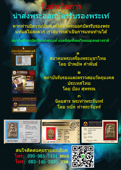 | ไม่ผ่านการตรวจสอบ | เนื่องจาก ภาพไม่ชัด / ข้อมูลไม่ครบ /ผิดเงื่อนไข (เช่น ลงพระซ้ำ) เมื่อไม่ ผ่านการตรวจสอบจะลบประกาศออกทันที หากต้องการแก้ไขหรือเพิ่มเติมให้ลงใหม่เท่านั้น |