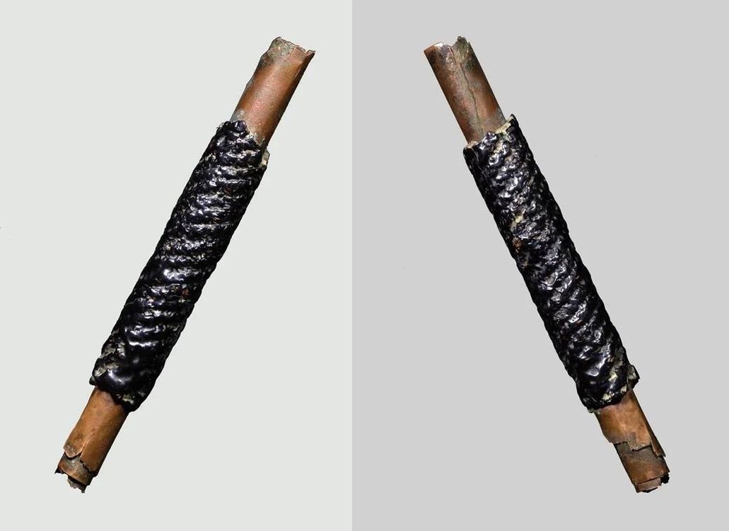 ทองแดงตัดสอบม้วน 3 รอบ ถักเชือกป่าน ผอกผง ลงรักแดงเก่า