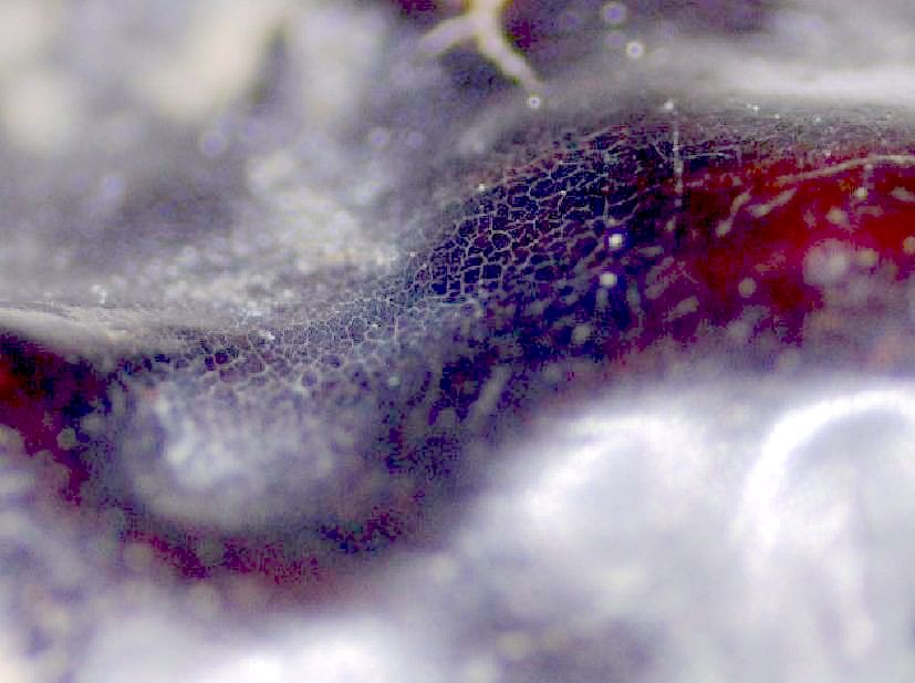 ส่องดูในรูตะกรุด มองเห็นขมวดยันต์ตารางอยู่ด้านในชัดเจน เท่าที่เห็นน่าจะเป็นยันต์ตรีนิสิงเหครับ