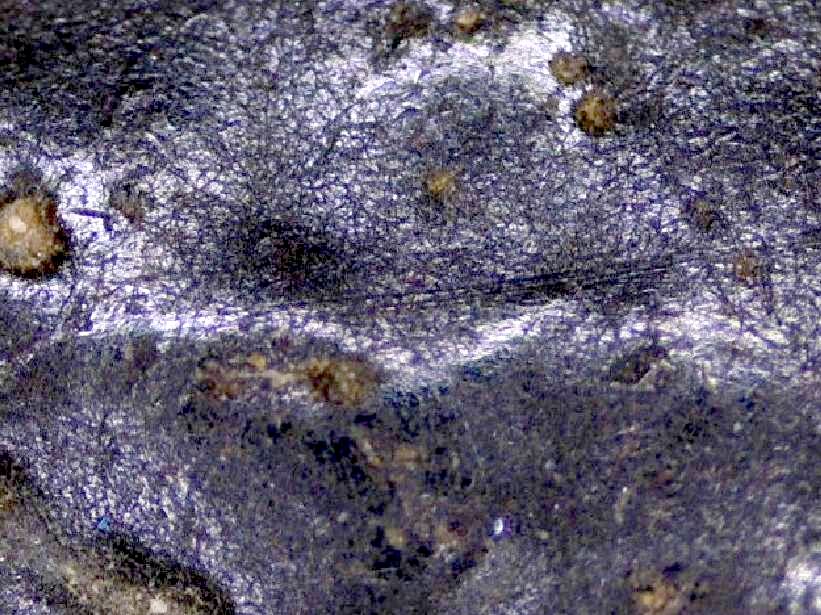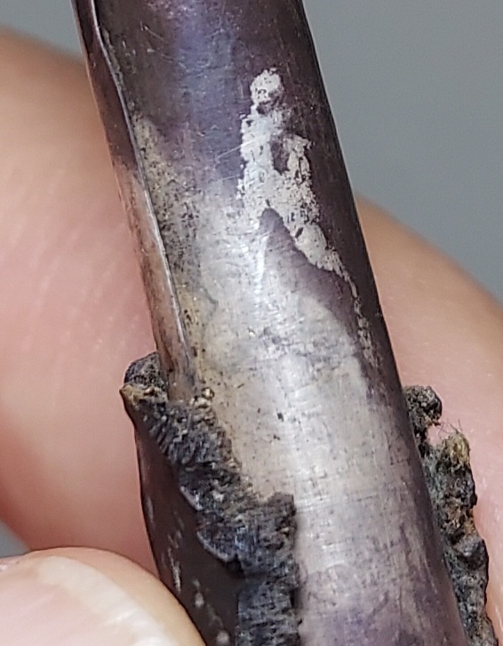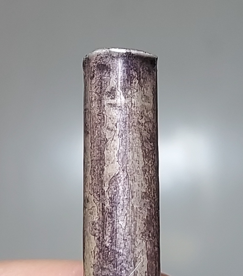 ดอกนี้เท่าที่ดู ไม่มีรอยจารนอก แต่หากส่องดูในรูตะกรุดทั้งสองด้าน จะมองเห็นขมวดยันต์ ซึ่งเป็นขมวดยันต์ของกรอบเส้นตารางยันต์( ตามรูปประกอบ ) ซึ่งเราเรียกว่า ยันต์ยมสลักเกล้า นอกจากนี้ เรายังมองเห็นเส้นยันต์และตัวยันต์ที่จารอยู่ด้านใน ทะลุออกมาให้เห็นที่ด้านนอกด้วย ตำแหน่งแรกที่ด้านนอกหัวตะกรุด จะปรากฏเส้นตารางที่จารด้านในทะลุออกมาด้านนอก และที่บริเวณกลางๆตัวตะกรุด จะปรากฏรอยจารตัว เฑาะว์ ที่จารจากด้านในทะลุออกมาให้เห็นที่ด้านนอก และยังมีตัวยันต์กลมๆอยู่ด้านข้างใกล้ๆกันด้วย