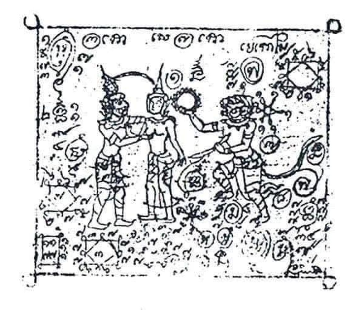 ยันต์นี้ด้านใน จะปรากฏรอยจารรูปของ นางมณโฑ มีผมไปมัดติดกับผมของทศกัณฑ์ และด้านข้างมีรูปหนุมานถวายแหวน( ถวายแหวนให้กับนางสีดา ตามท้องเรื่องในรามเกียรติ์ )