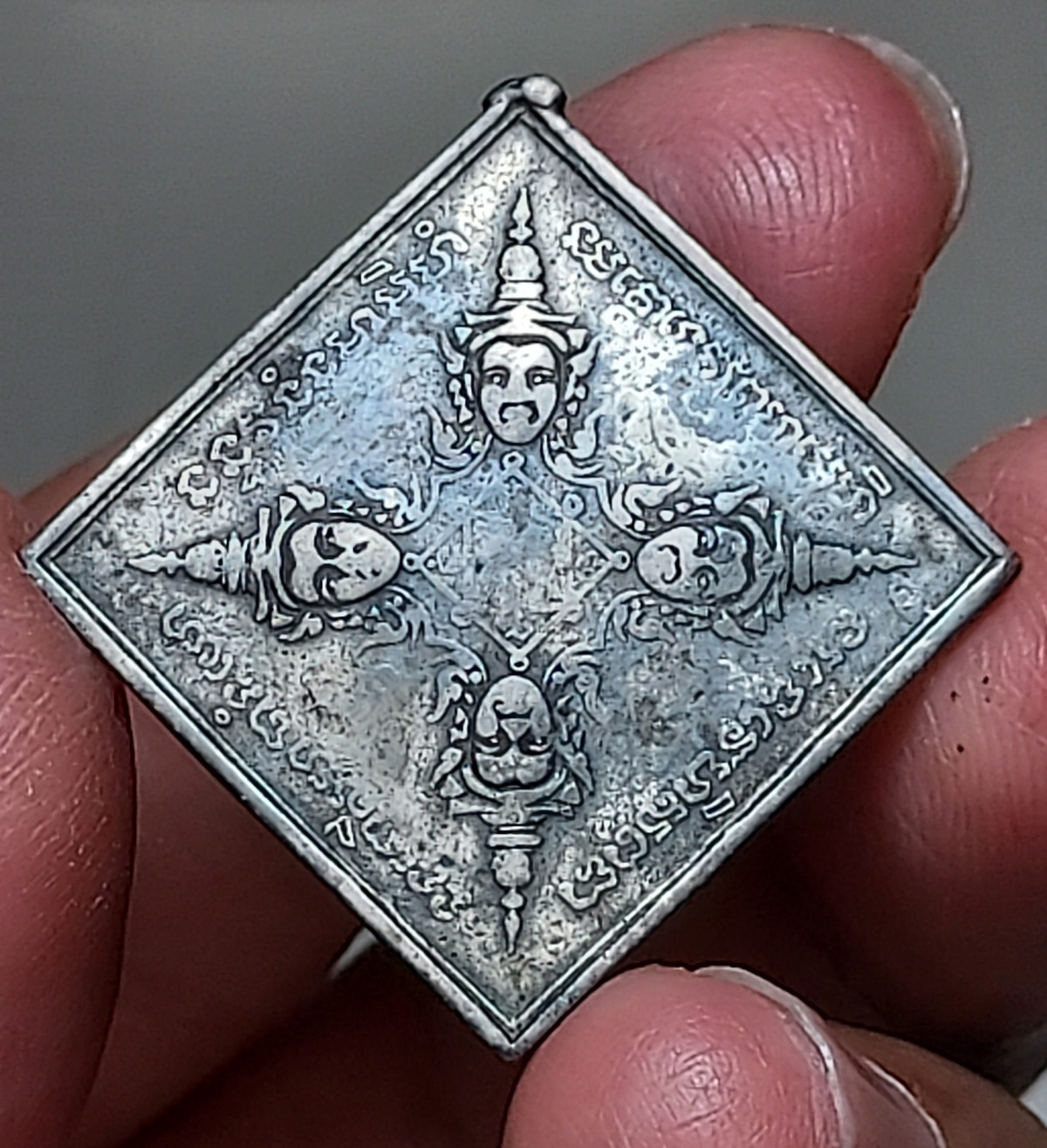 ลักษณะเป็นเหรียญปั๊มรูปทรงข้าวหลามตั้ด หูห่วงเชื่อม ด้านหน้าเหรียญรูปพระพรหมสี่หน้า (รัศมีพรหม) และมีอักขระยันต์ ด้านหลังเหรียญเรียบปรากฏร่องรอยการลงเหล็กจารอักขระยันต์