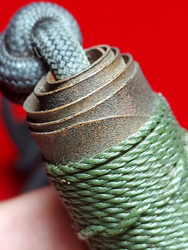 ขนาดความยาว 7 นิ้วนิดๆ โต 1.7 เซ็น โลหะฝาบาตรอย่างหนา เก่าจนส่าแดงขึ้นเต็มเหมือนเนื้อสำริด ม้วนหลวมๆ 5 รอบ ตัดสอบแบบโค้งลึก