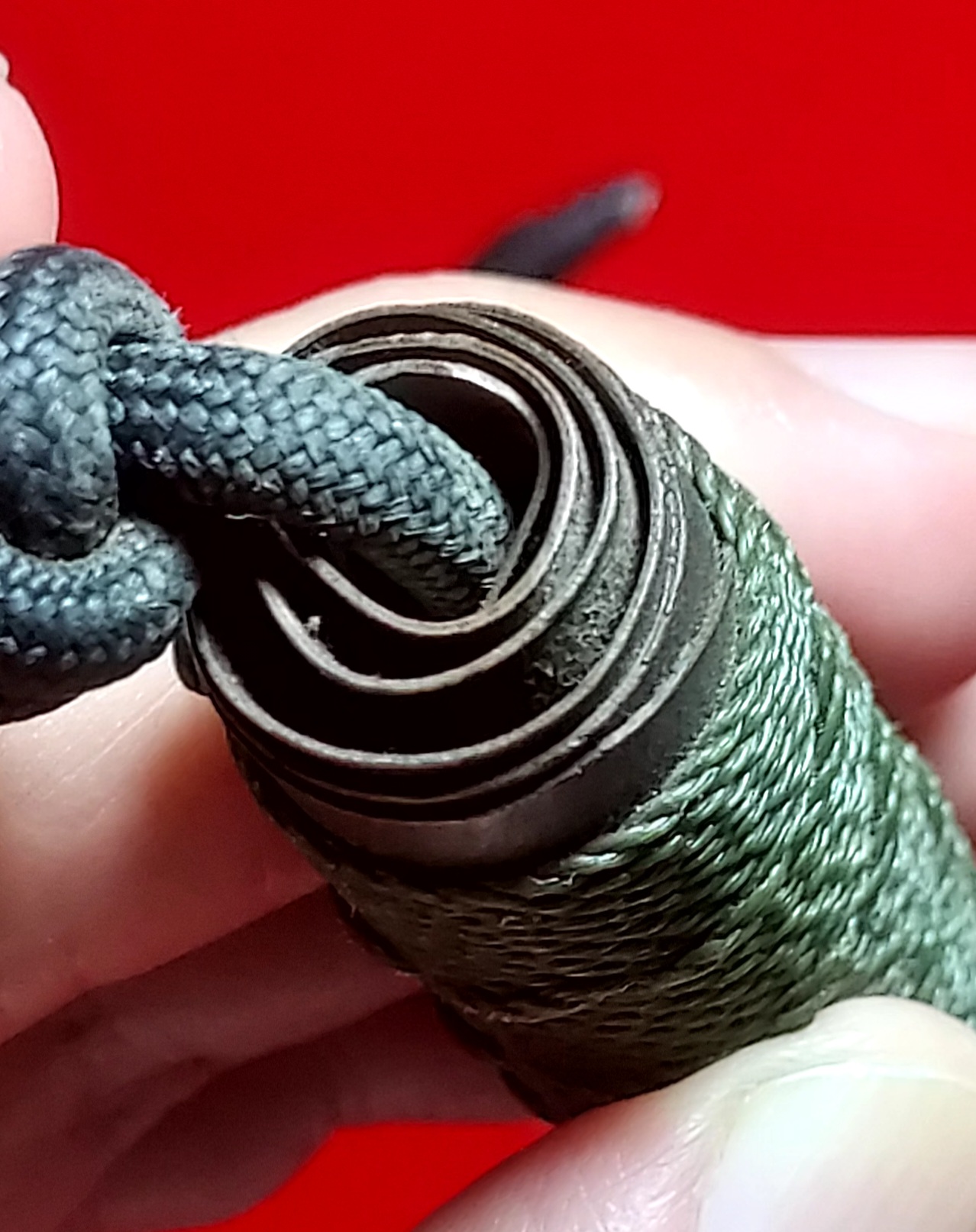 ตะกรุดดอกนี้ เดิมทีเชือกได้เปลื่อยหลุดออกจนหมด เจ้าของคนล่าสุดได้นำมาถักเชือกใหม่ด้วยเชือกไนล่อน เพื่อนำมาใช้ติดตัวบูชา