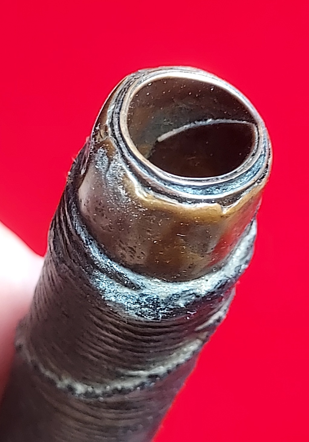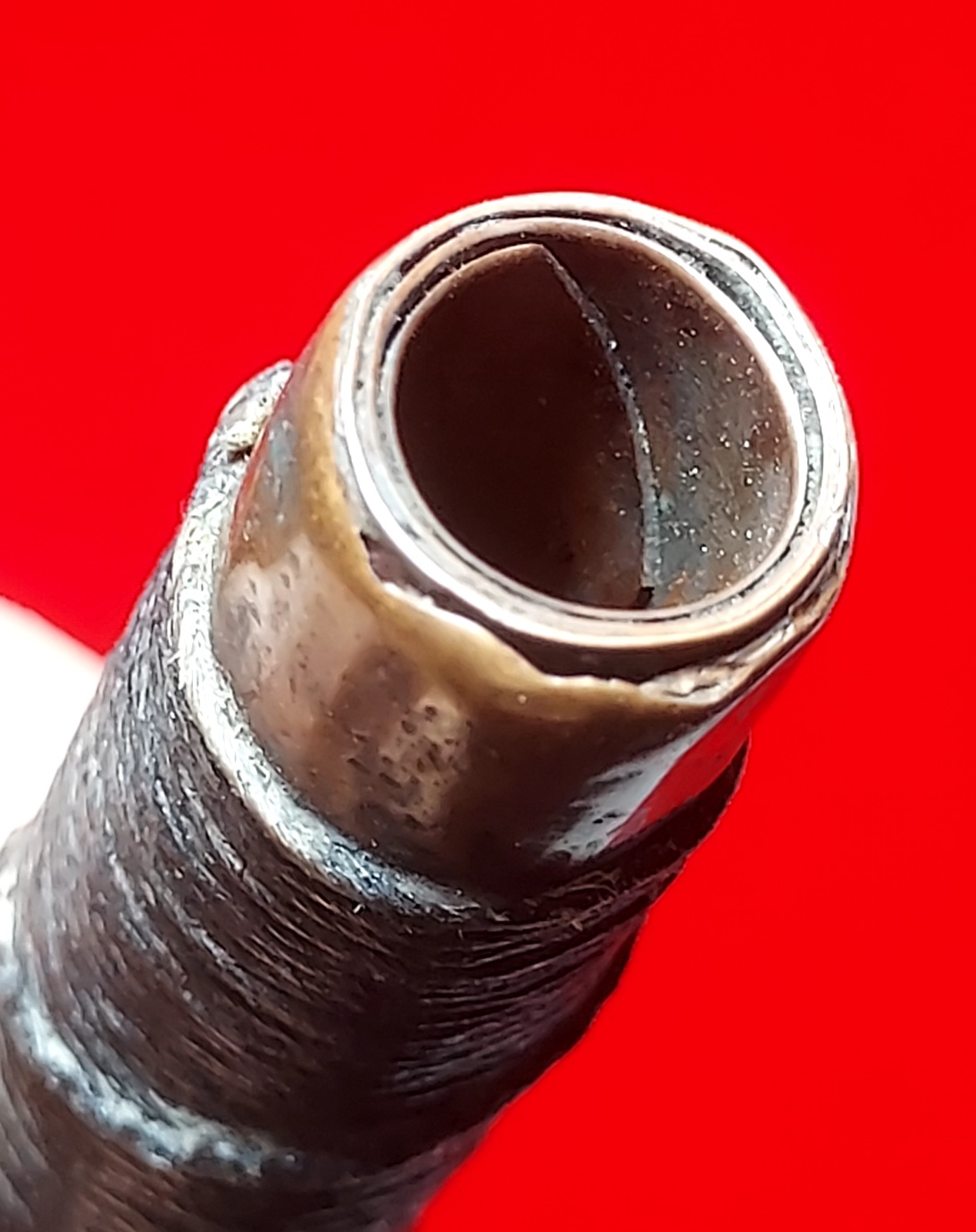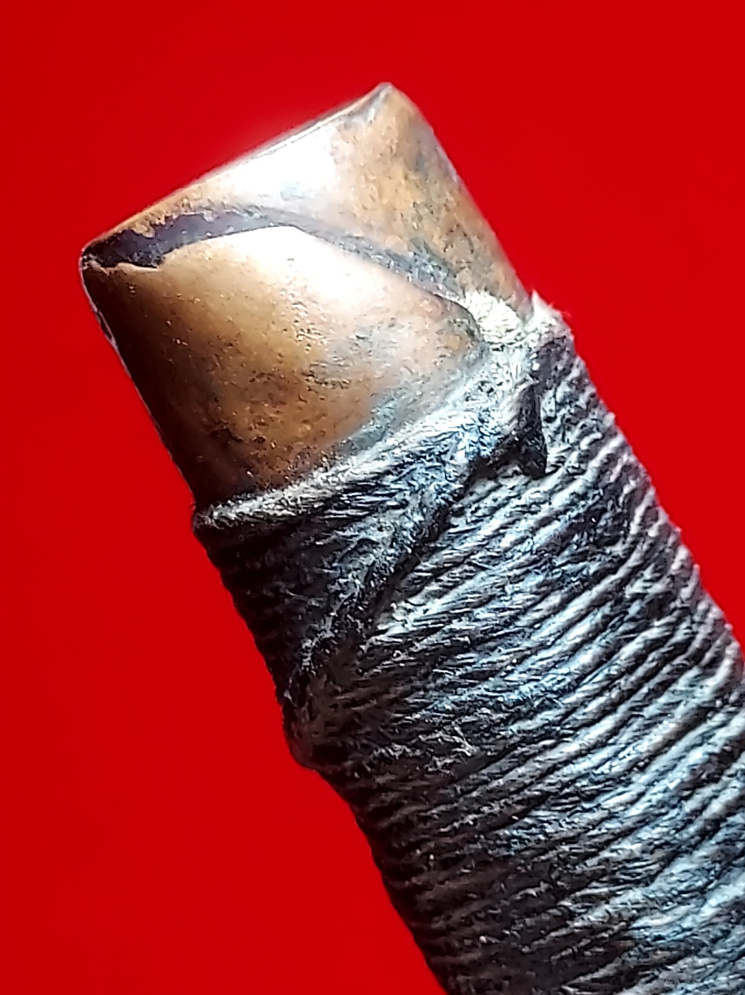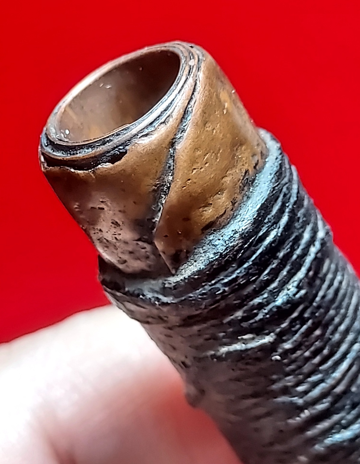 เนื้อโลหะทองแดงตัดสอบแบบโค้ง ม้วน 4 รอบเกือบๆ 4.5 รอบ ด้านในรูตะกรุด มองเห็นจาร